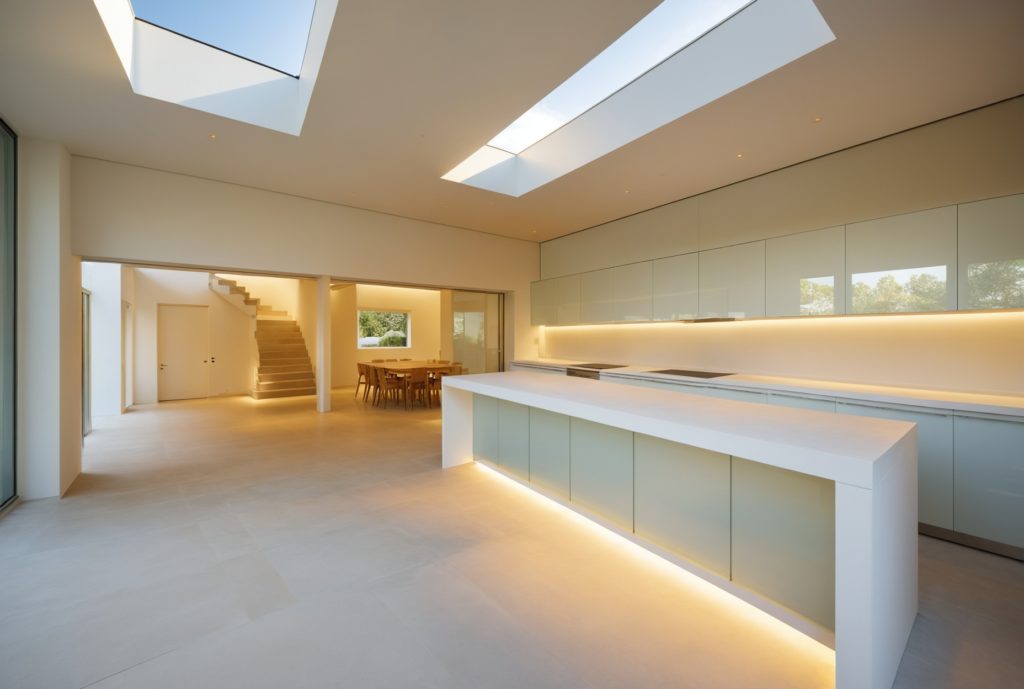 A key feature of the redesign is the creation of a contemporary, light-filled kitchen, living, and dining space that opens directly onto a new garden patio. The project embodies a minimal, elegant approach to modern family living while remaining sensitive to the architectural heritage of its setting.